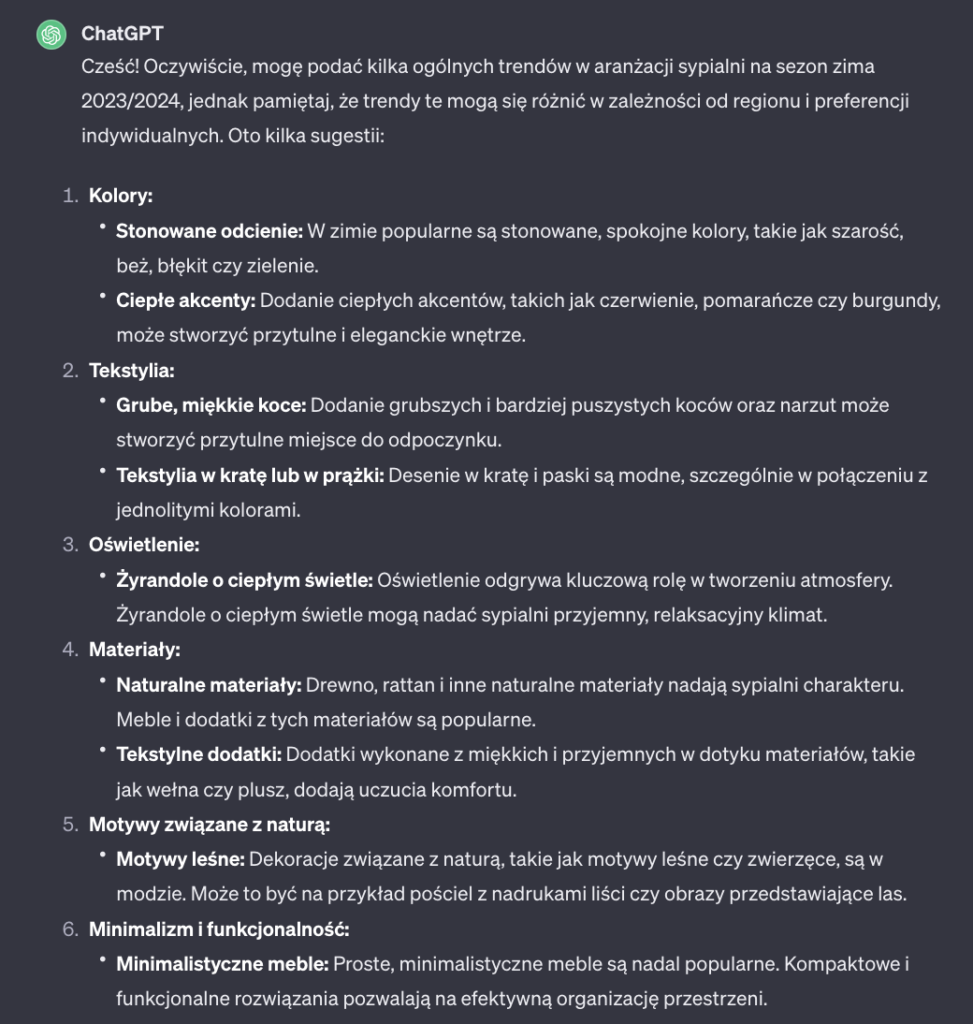 Na początek, w ramach inspiracji, możemy skorzystać z darmowego narzędzia ChatGPT, które pozwoli nam zebrać garść pomysłów potrzebnych do realizacji naszej wizji. Po zadaniu krótkiego pytania otrzymamy kilka informacji na temat najnowszych trendów wnętrzarskich, które następnie możemy wykorzystać do tworzenia pierwszych wizualizacji AI lub w rozmowie ze studiem projektowym. Nierzadko podsunięty przez sztuczną inteligencję pomysł może stać się motywem przewodnim naszego wnętrza.
