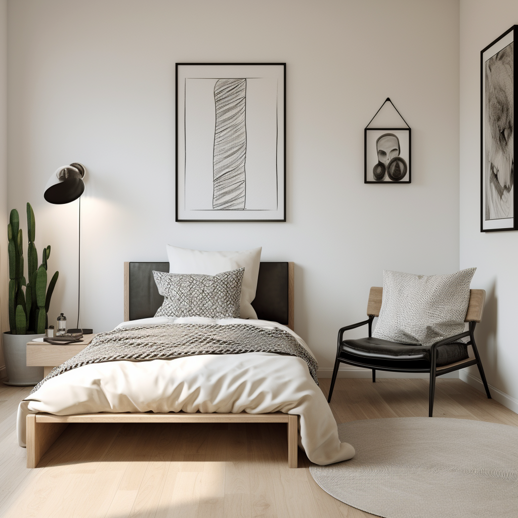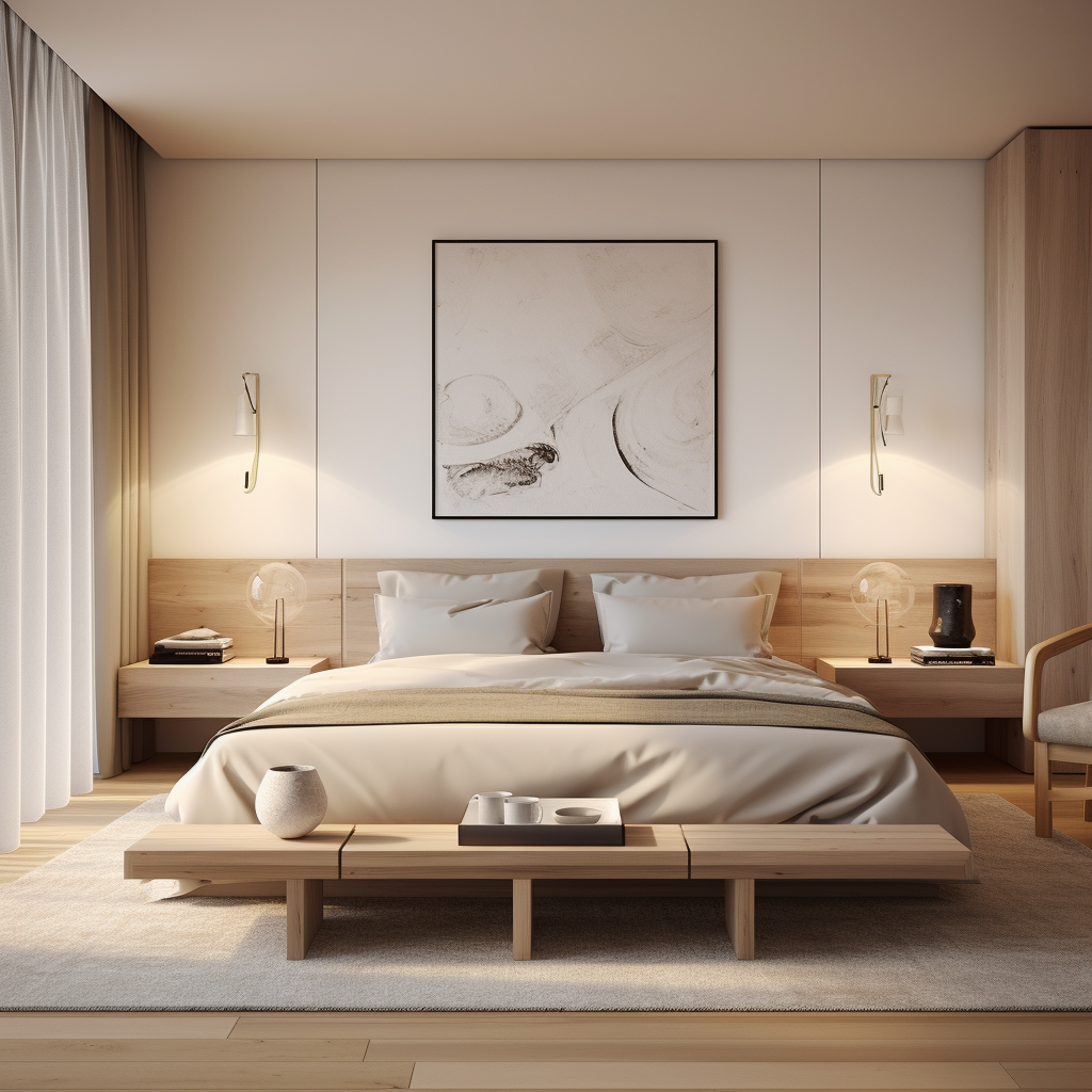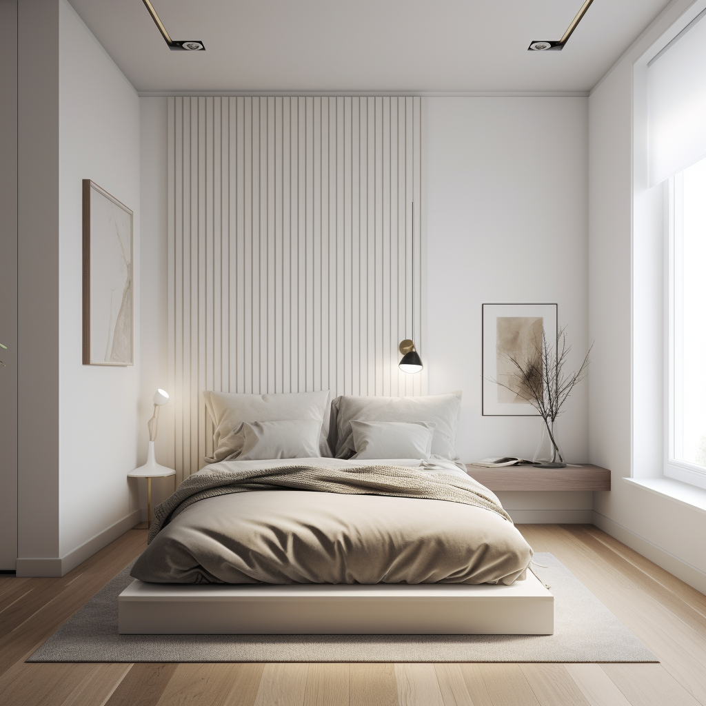 W projektowaniu sypialni wiele serc nadal podbija trend minimalistyczny. Cytując klasyka „mniej znaczy więcej”. Proste, geometryczne kształty i spokojne kolory sprawiają, że przestrzeń snu staje się miejscem harmonii i spokoju. Sztuczna inteligencja, np. aplikacja Midjourney, z której korzystaliśmy, może pomóc w doborze minimalistycznych mebli, wyeliminowaniu zbędnych ozdób i skupieniu się na esencji designu. Kompaktowe i funkcjonalne rozwiązania, zintegrowane z technologią, pozwalają na efektywną organizację przestrzeni. A to jest kluczowe, zwłaszcza w mniejszych sypialniach.