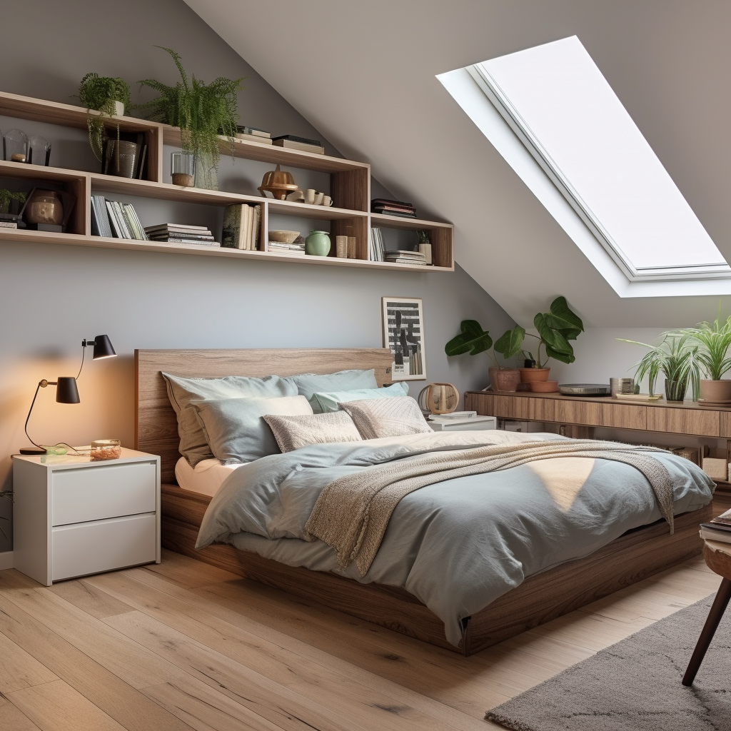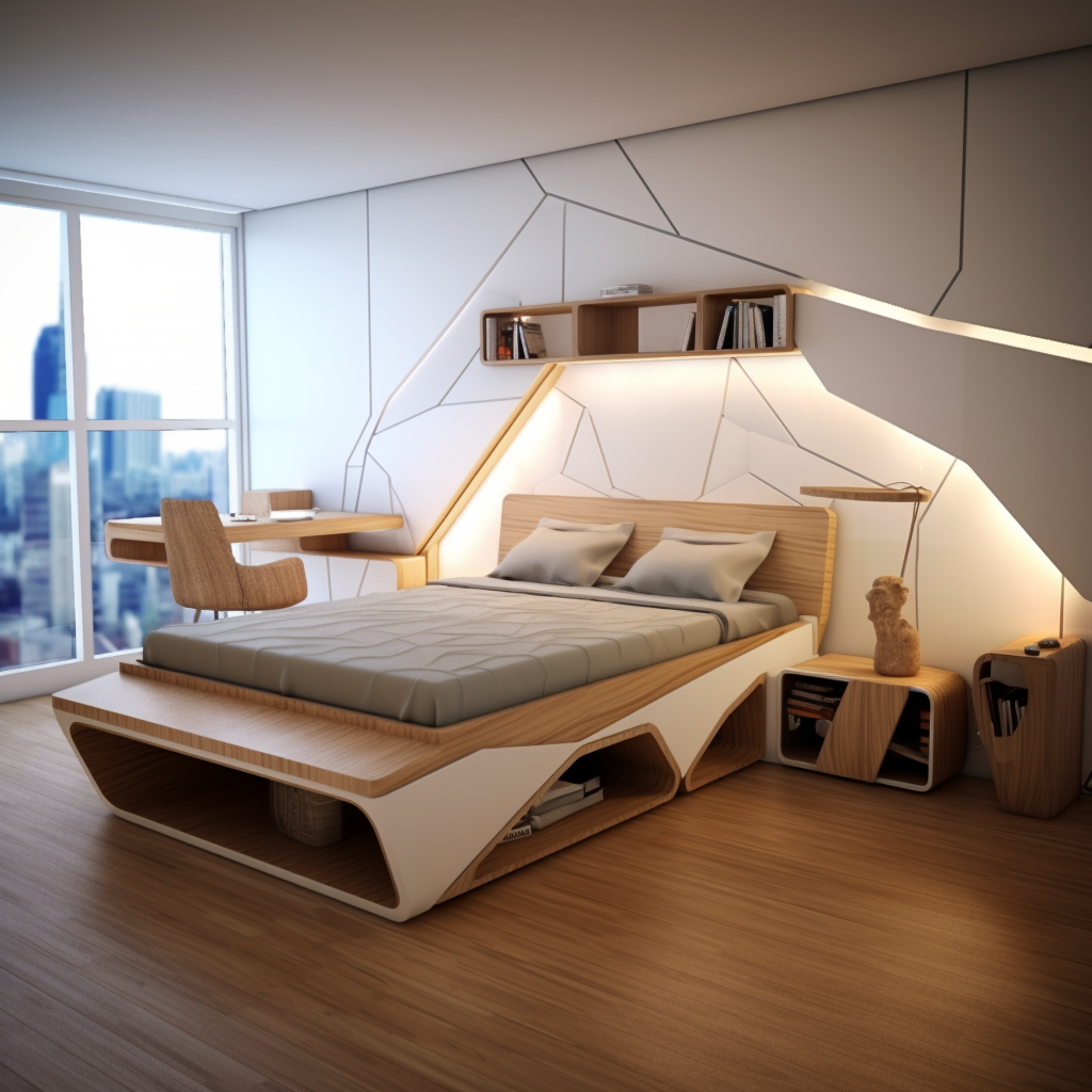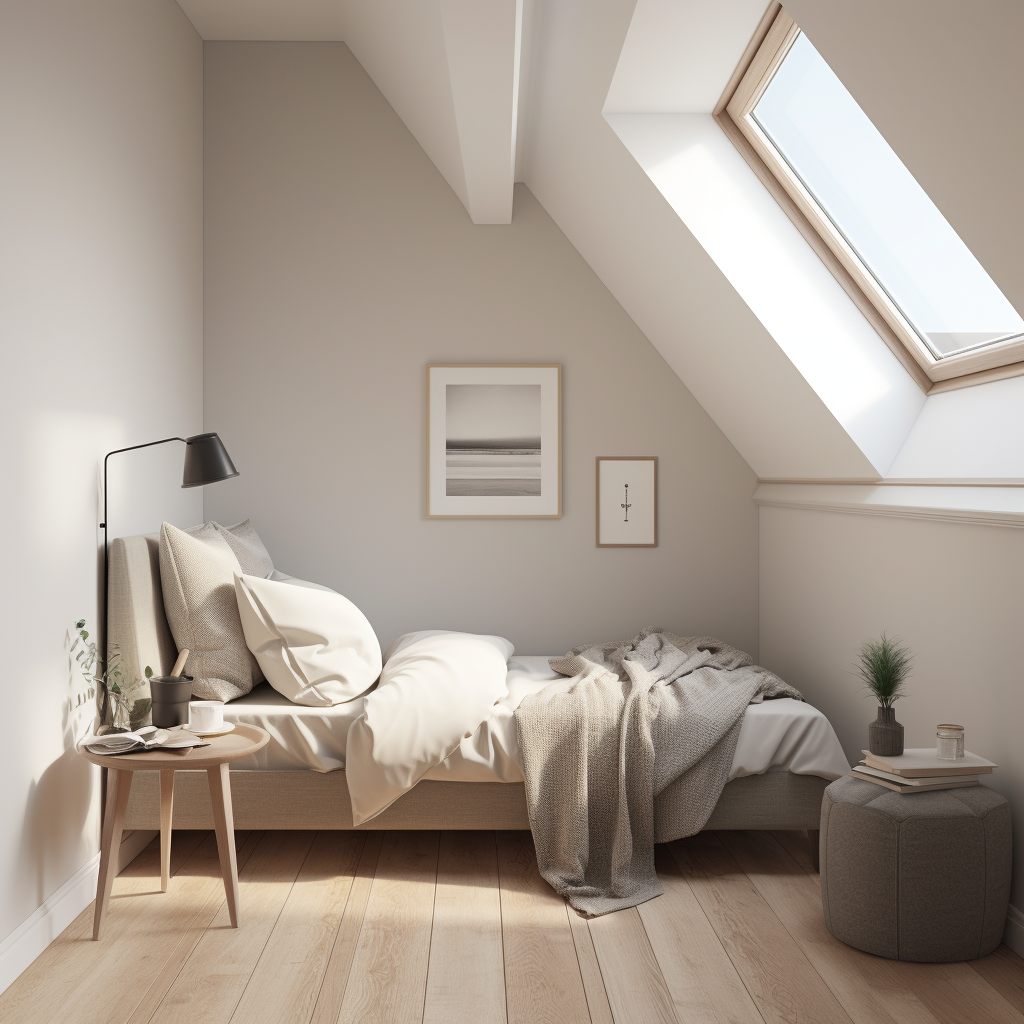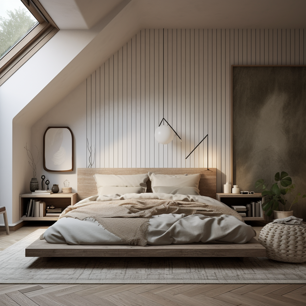W projektowaniu sypialni wiele serc nadal podbija trend minimalistyczny. Cytując klasyka „mniej znaczy więcej”. Proste, geometryczne kształty i spokojne kolory sprawiają, że przestrzeń snu staje się miejscem harmonii i spokoju. Sztuczna inteligencja, np. aplikacja Midjourney, z której korzystaliśmy, może pomóc w doborze minimalistycznych mebli, wyeliminowaniu zbędnych ozdób i skupieniu się na esencji designu. Kompaktowe i funkcjonalne rozwiązania, zintegrowane z technologią, pozwalają na efektywną organizację przestrzeni. A to jest kluczowe, zwłaszcza w mniejszych sypialniach.