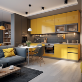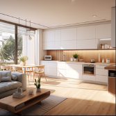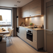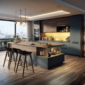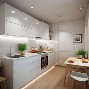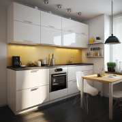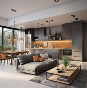 W dzisiejszych czasach coraz częściej spotykamy się z układem mieszkania, w którym salon połączony jest z aneksem kuchennym. Również w takim wypadku warto trochę poeksperymentować z projektem, a sztuczna inteligencja wydaje się doskonałym narzędziem, aby niskim kosztem spróbować nowych, odważniejszych rozwiązań i zobaczyć, czy faktycznie nam odpowiadają. Jeśli projektujemy aneks kuchenny, to zachowajmy styl całego salonu lub wprowadźmy dodatkowy kolor, który oddzieli strefę kuchenną od tej wypoczynkowej. Z takimi narzędziami ogranicza nas tylko wyobraźnia.